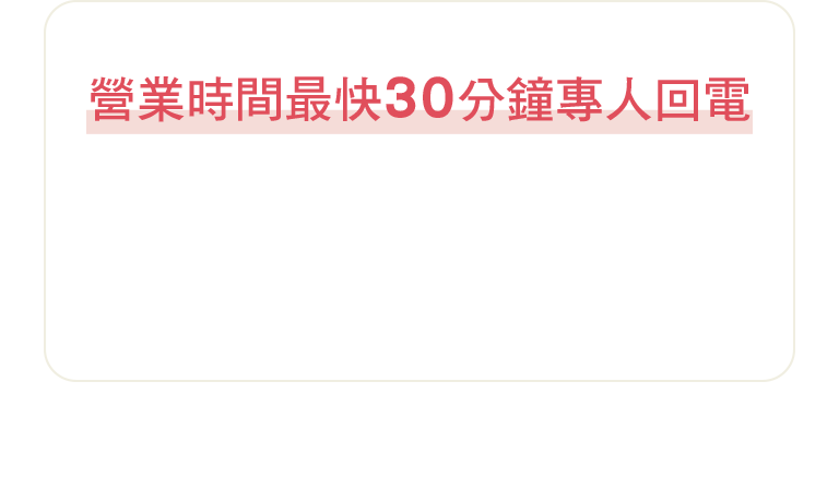 營業時間最快30分鐘內專人回電限於營業時間內適用,台新銀行營業時間為週一至週五09:00~17:30,例假日除外。