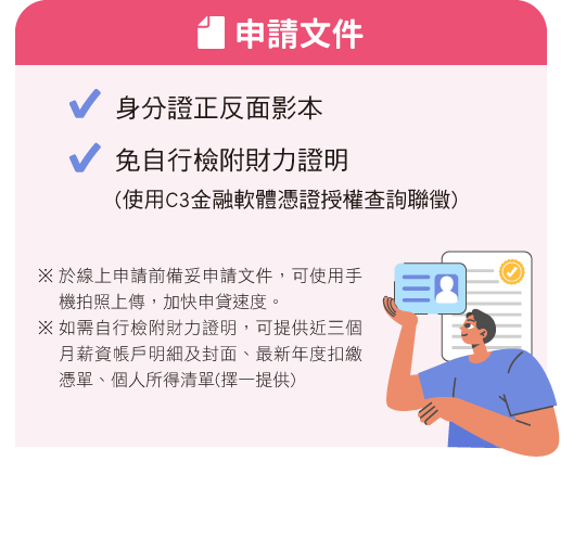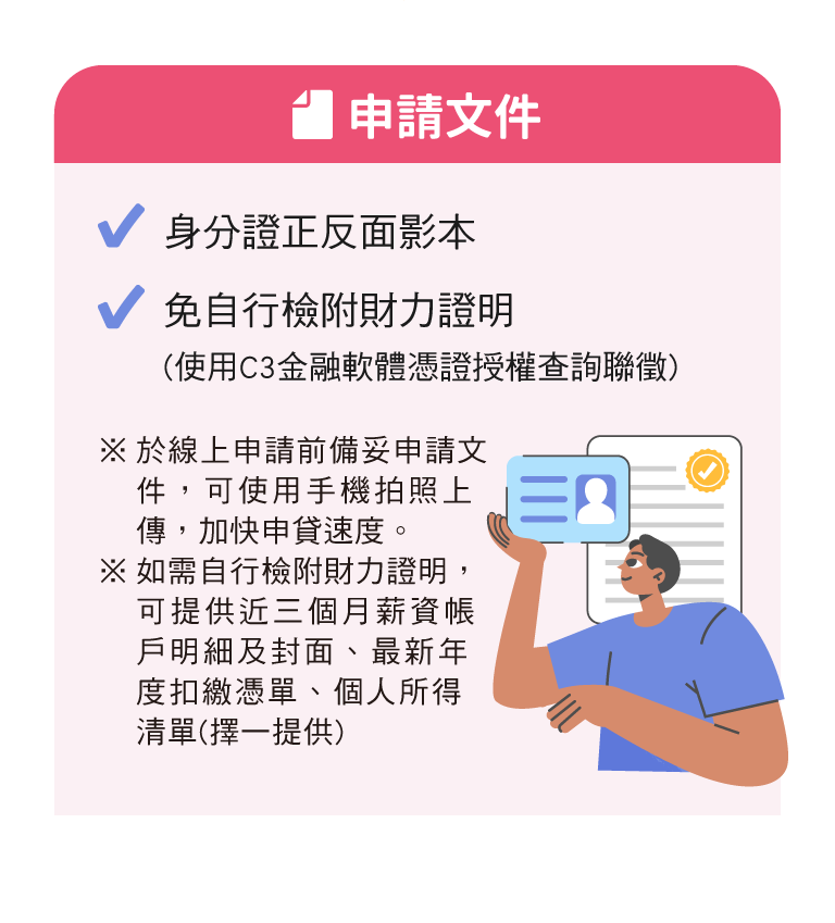 C3金融軟體憑證功能之適用對象為台新銀行既有存款客戶(不包含第三類數位存款帳戶)及貸款客戶,於申辦時同步設定「金融軟體憑證」密碼並勾選同意條款,即可授權台新銀行透過聯合徵信中心查詢所得、投保等相關資料,省去自行檢附財力證明的時間,加快申請速度,惟台新銀行仍保留文件徵提之權利。