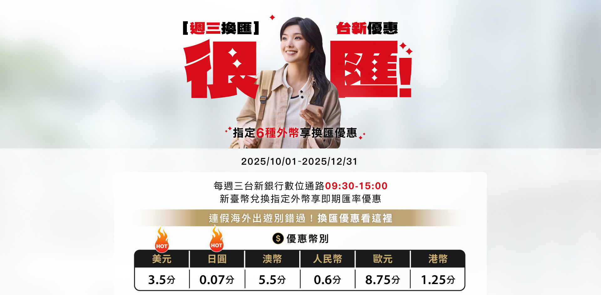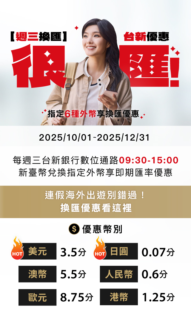 台新銀行提供新臺幣兌換6種外幣享匯率優惠!美元最高-3.5分、日圓-0.07分!換匯讓分優惠首選台新