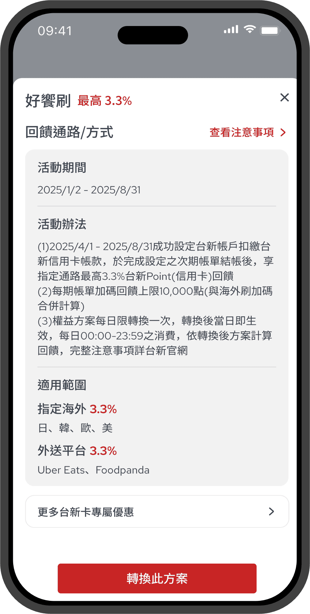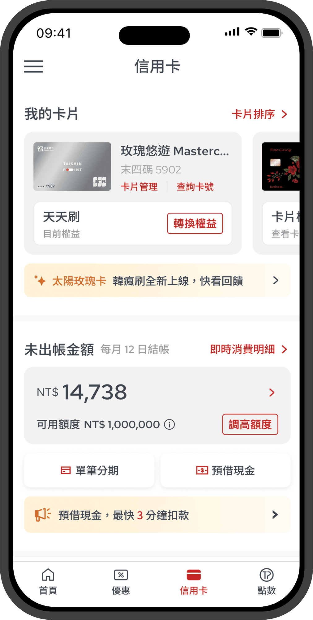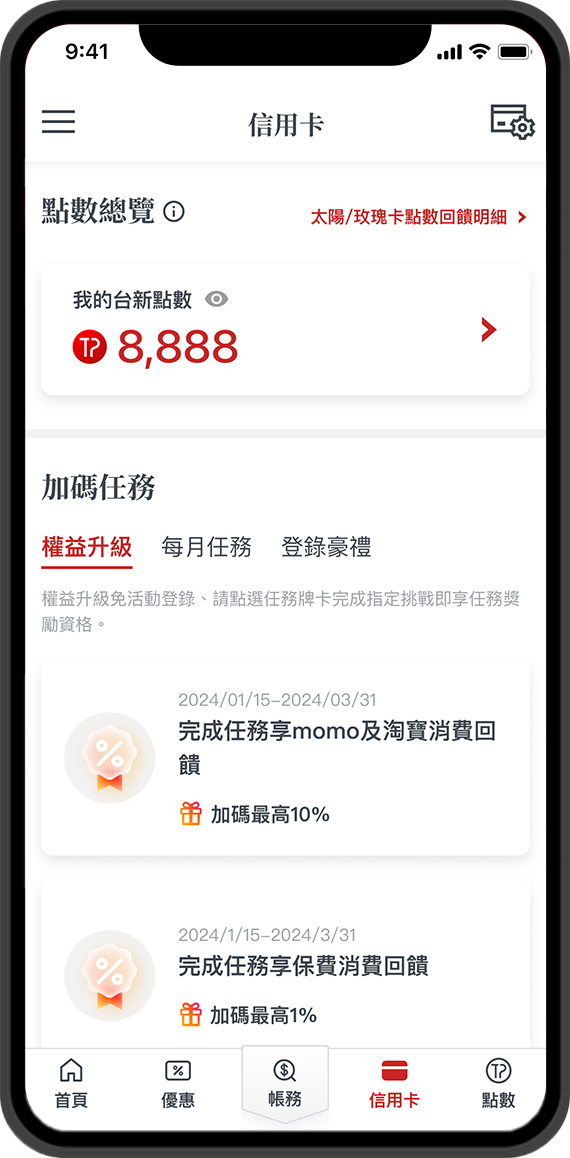 - 申請人同意於申辦任何等級之信用卡別時,台新銀行得評估信用狀況,核予申請人信用卡額度。