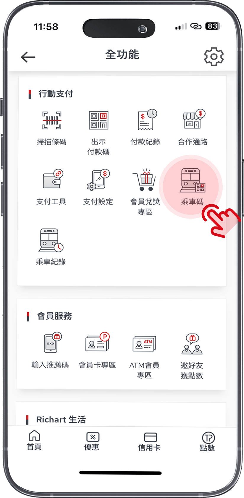 登入Richart Life APP>點擊優惠tab> 點擊最上方「優惠券」icon>進入「行動生活」類別>點選【北捷感應乘車 刷台新卡,國際Pay 最高前10筆票價回饋】 加碼優惠券>完成領取。