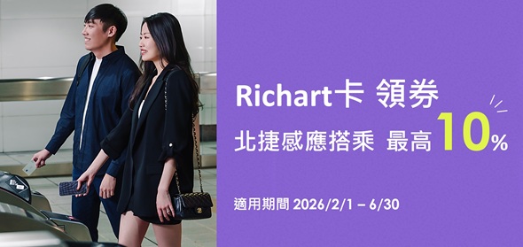 活動期間於台新Richart Life APP領券,感應乘車享最高5次免費(每正卡人回饋上限100元)。