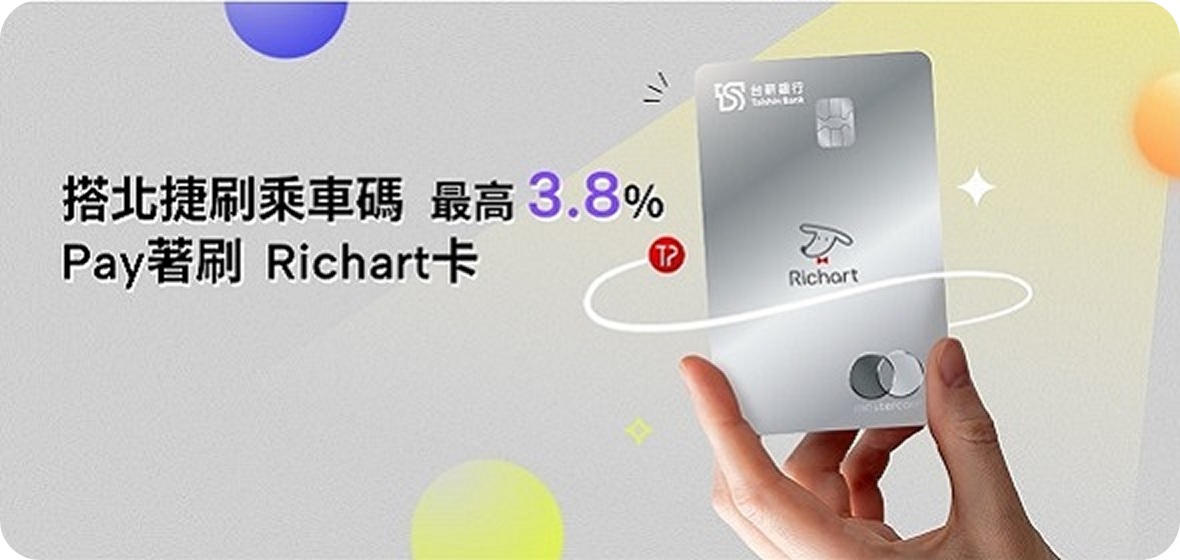 活動期間於台新Richart Life APP領券,感應乘車享最高5次免費(每筆最高回饋刷卡金20元,每正卡人回饋上限100元)。
